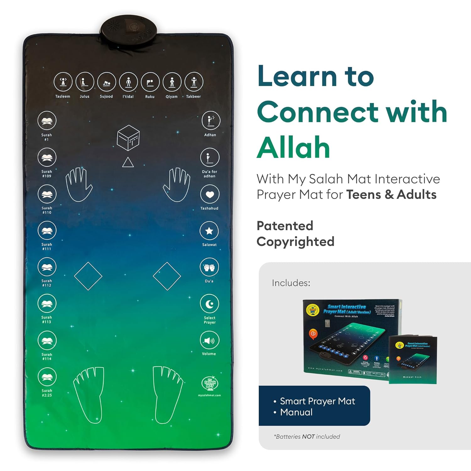 Euloura interactive prayer mat, multilingual audio guidance system, step-by-step Salah instructions guide book, rechargeable power pack, durable carrying case.